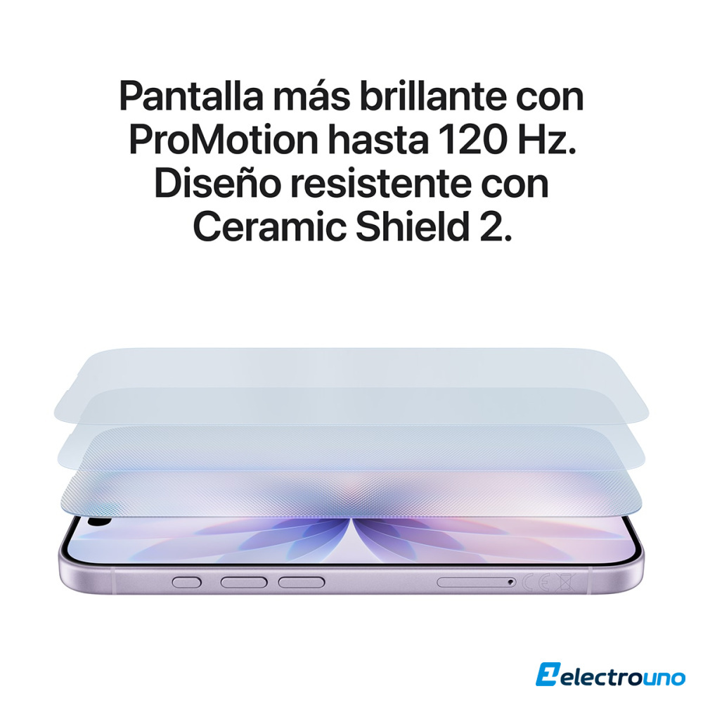 iPhone 17. Más resistente. Y aún más irresistible. Pantalla de 6,3 pulgadas con ProMotion, Ceramic Shield 2, dos cámaras traseras de 48 Mpx, cámara frontal Center Stage, chip A19 y mucho más.