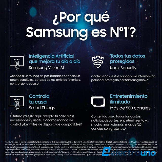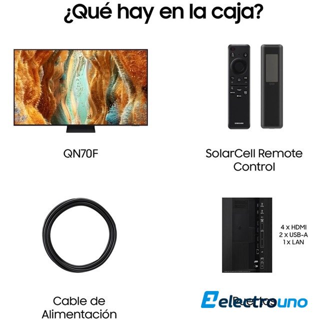 Especificación Detalle Pantalla 65" (165,1 cm) Neo QLED, resolución 4K Ultra HD (3840 x 2160 px), Mini LED, plana Frecuencia de refresco 100 Hz nativo, soporta hasta 144 Hz en gaming Procesador NQ4 AI Gen2 (20 redes neuronales, AI Upscale) HDR Neo Quantum HDR, HDR10+ Adaptive/Gaming, HLG, Filmmaker Mode Sintonizadores 2x digital/analógico, DVB-C/S2/T2 Smart TV Tizen OS, compatible AirPlay 2, Apps, Gaming Hub, Samsung TV Plus Conectividad WiFi 5 (802.11ac), Bluetooth 5.3, Ethernet LAN, 4x HDMI, 2x USB 2.0, salida óptica, CI+ 1.4 Audio 2 altavoces, 20W RMS, Object Tracking Sound Lite, Q-Symphony, eARC, Adaptive Sound Pro Dimensiones con soporte 1451,7 × 279,4 × 890,4 mm (An x Pr x Al), 21,8 kg VESA 400 × 300 mm Consumo 84 W típico, 0,5 W en espera Eficiencia energética Clase E (SDR) / G (HDR) Diseño Negro, AirSlim, peana central, bisel ultra fino Accesorios Incluidos Soporte de sobremesa, mando TM2560E SolarCell, cable corriente -