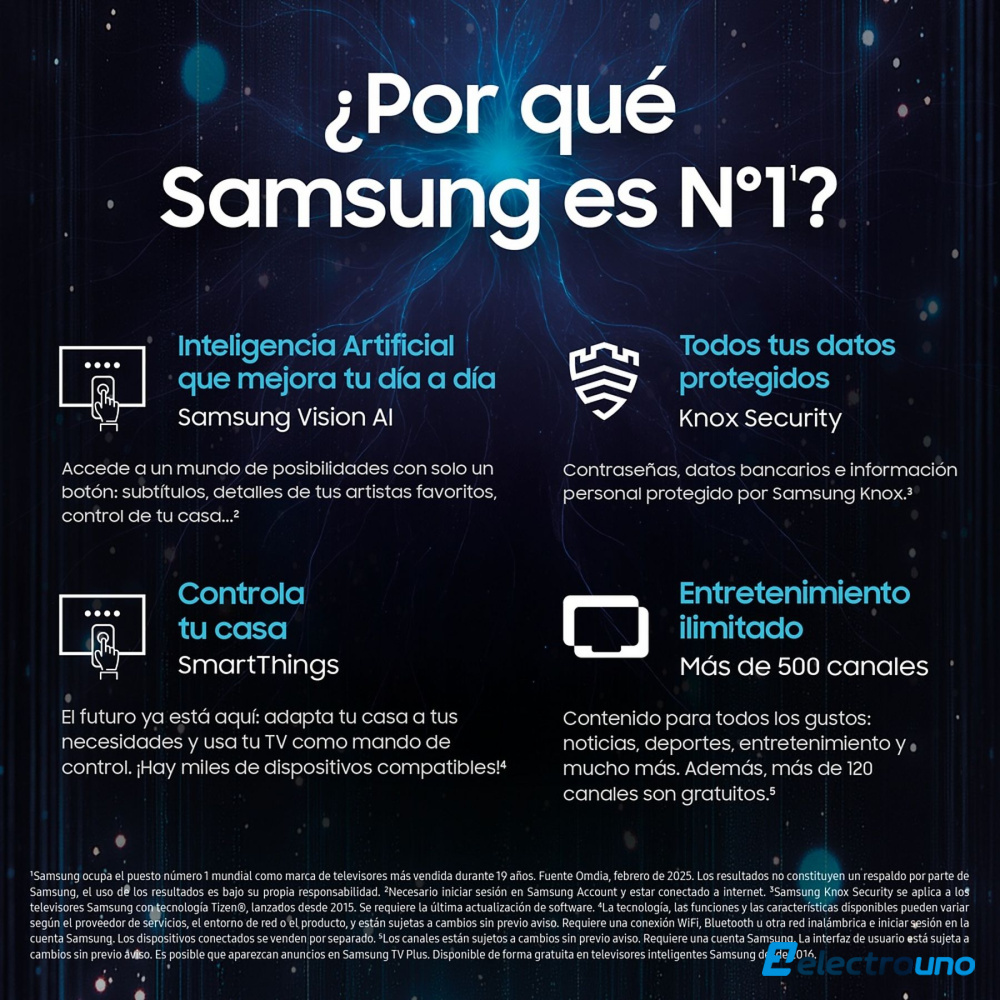 Experimenta el verdadero poder de la imagen con el Samsung Q7F, el televisor perfecto para quienes buscan una calidad cinematográfica en casa. Equipado con las últimas innovaciones en tecnología QLED y procesamiento de imagen, este modelo lleva tu experiencia de entretenimiento a un nivel completamente nuevo.Características: