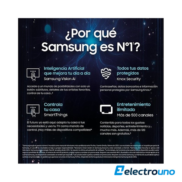 Samsung Vision AI ha llegado. Inteligencia Artficial que mejora tu día a día. El procesador con AI ayuda a optimizar tu experiencia. El poderoso escalado a 4K te asegura la resolución que esperas ver. Imágenes reales con colores más precisos gracias a la auténtica tecnología Quantum dot. Convierte la luz en más de mil millones de colores a cualquier nivel de brillo para que disfrutes del contenido plenamente.