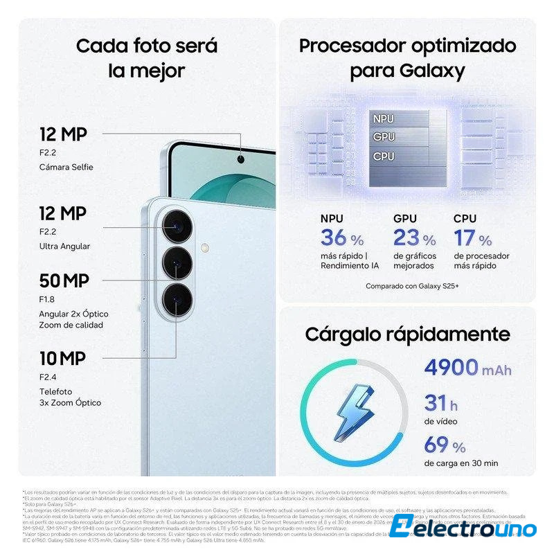 Ver descripción completaEl Samsung Galaxy S26 Plus 5G es la herramienta definitiva para quienes buscan rendimiento, fotografía avanzada y autonomía en un solo dispositivo. El dispositivo incluye Galaxy S26 Plus y cable USB-C, eliminando la necesidad de comprar accesorios adicionales.